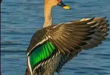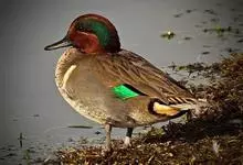 绿翅鸭是小型鸭类,体长37厘米,体重约0.5千克。嘴脚均为黑色。雄鸟头至颈部深栗色,头顶两侧从眼开始有一条宽阔的绿色带斑一直延伸至颈侧,尾下覆羽黑色,两侧各有一黄色三角形斑,在水中游泳时,极为醒目。…全部>>