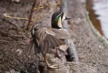 绿翅鸭是小型鸭类,体长37厘米,体重约0.5千克。嘴脚均为黑色。雄鸟头至颈部深栗色,头顶两侧从眼开始有一条宽阔的绿色带斑一直延伸至颈侧,尾下覆羽黑色,两侧各有一黄色三角形斑,在水中游泳时,极为醒目。…全部>>