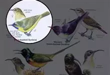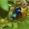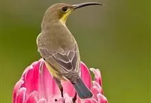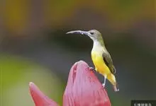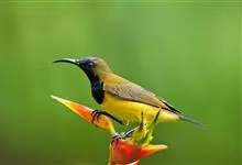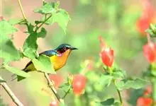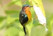 黑胸太阳鸟:小型鸟类,体长9-15厘米。嘴细长而向下曲。雄鸟中央尾羽特长,尾呈楔形,头顶至后颈紫蓝色具金属光泽;背褐红色,腰有一黄色横带,尾上覆羽和尾紫蓝色;颏、喉和上胸乌黑色,有的下胸为硫黄色,…全部>>