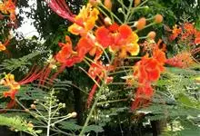 洋金凤 Sw.),豆科小凤花属灌木状或小乔木植物,枝无毛,绿或粉绿色;二回羽状复叶;总状花序伞房状,萼片无毛,花瓣橙红或黄色,圆形,花丝红色,子房无毛,花柱橙黄色;荚果窄而薄,…全部>>