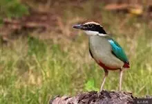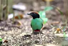 绿胸八色鸫:是雀形目八色鸫科的鸟类,共有12个亚种。体长为16-18厘米,体重65-69克。体型圆胖,尾短,腿长。头黑,上体绿色,两翼深色而具白色斑纹,头顶至后枕深褐,胸及腹部苹果绿,臀亮红。…全部>>