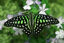 青带凤蝶Graphium sarpedon ,又名青凤蝶,是最普遍的中型凤蝶,飞行速度很快。青带凤蝶的翅膀中央有许多浅蓝色的斑点,很整齐地排列成一条直线。这些斑点由上而下逐渐变大,就像一条青色的带子。全部>>