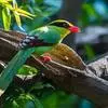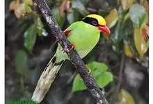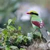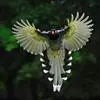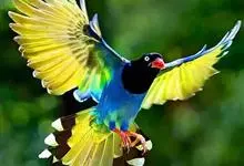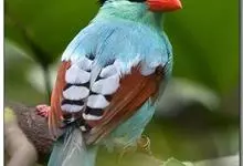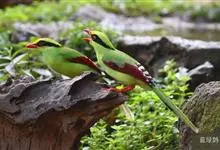 蓝绿鹊:中型鸟类,共有5个亚种。体长36-38厘米。尾长,嘴、脚红色。通体羽色主要为草绿色,宽阔的黑色贯眼纹向后延伸到后颈,在绿色的头侧极为醒目。两翅栗红色,内侧飞羽具黑色次端斑和白色尖端。尾绿色,…全部>>