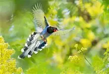 台湾蓝鹊:体长64至65厘米,翼展18至21厘米,尾长约40厘米,尾羽长占了总体长的三分之二。头、脸、颈、喉、胸都是黑色,黄色的眼珠包围黑色的瞳孔,鲜红色的鸟喙、双脚,…全部>>