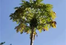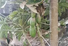 番木瓜,番木瓜科番木瓜属的常绿软木质小乔木,高达10米,具有乳汁;茎不分枝或有时于损伤处分枝;叶大且聚生于茎顶,近似盾形,叶柄中空;花单性或两性,有些品种雄株偶尔生两性花或雌花,…全部>>