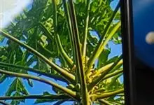 番木瓜,番木瓜科番木瓜属的常绿软木质小乔木,高达10米,具有乳汁;茎不分枝或有时于损伤处分枝;叶大且聚生于茎顶,近似盾形,叶柄中空;花单性或两性,有些品种雄株偶尔生两性花或雌花,…全部>>