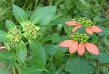 猩猩草:常绿或半常绿灌木,盆栽时株高0.5米-2米,在亚热带地区可长到6米以上。茎直立而光滑,单叶互生,卵状椭圆形至阔披针形,具不规则的深缺刻。长10-15厘米。花小,有蜜腺,排列成密集的伞房花序。…全部>>