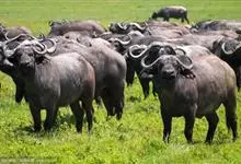 非洲野水牛:共有5个亚种。头体长2.1-3.4米,身高1-1.7米,体重300-900千克。胸膛宽阔,四肢粗壮,头大角长,雄性的角从头部向外和向下扩散,在一些雄性中,角通过覆盖头部的大盾连接。头顶的…全部>>