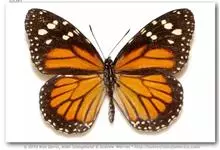 黑脉金斑蝶:翅阔8.6-12.4厘米。雄蝶较雌蝶为大。成年蝶颜色鲜艳,翅膀上有显眼的橙色及黑色斑纹,周围是宽阔的黑色边框,布有许多白色斑点。这种引人注目的着色是对捕食者的视觉警告,表示这个物种有毒;…全部>>