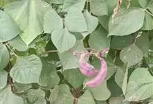 扁豆 Sweet)是豆科扁豆属多年生缠绕藤本植物,又名鹊豆、沿篱豆、藤豆等。全株几无毛,茎长可达6米。羽状复叶具3小叶;托叶基着,叶片披针形;小托叶线形,小叶宽三角状卵形,宽与长相等,…全部>>