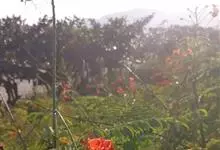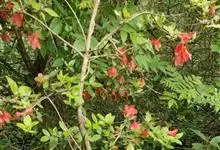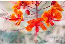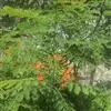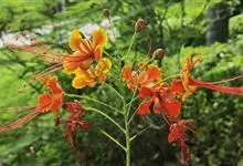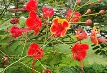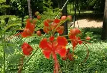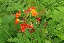 洋金凤 Sw.),豆科小凤花属灌木状或小乔木植物,枝无毛,绿或粉绿色;二回羽状复叶;总状花序伞房状,萼片无毛,花瓣橙红或黄色,圆形,花丝红色,子房无毛,花柱橙黄色;荚果窄而薄,…全部>>
