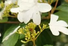 蝴蝶戏珠花 Miq.)是荚蒾科荚蒾属植物。落叶灌木,高达3米;当年小枝浅黄褐色。叶较狭,宽卵形或矩圆状卵形,有时椭圆状倒卵形。花序直径4-10厘米,外围有4-6朵白色、木型的不孕花。果实先红色后变黑色,…全部>>