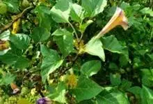 洋金花是茄科曼陀罗属植物,一年生草本植物,全株近于无毛。茎直立,圆柱形,高30~100cm,基部木质化,上部呈义状分枝。叶互生,上部的叶近于对生;叶柄长2~6cm,表面被疏短毛;叶片卵形、长卵形或心形,…全部>>