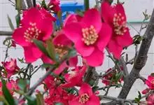 贴梗海棠Nakai)是蔷薇科、木瓜海棠属植物。落叶灌木,高达2米,枝条直立开展,有刺。叶片卵形至椭圆形,稀长椭圆形,长3-9厘米,宽1.5-5厘米。花先叶开放,3-5朵簇生于二年生老枝上。…全部>>