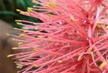 网球花是石蒜科,网球花属多年生草本植物。鳞茎球形,叶片长圆形,叶柄短,鞘状。花茎直立,实心,高可达90厘米,先叶抽出,淡绿色或有红斑;伞形花序具多花,花红色;花被管圆筒状,花被裂片线形,花丝红色,…全部>>