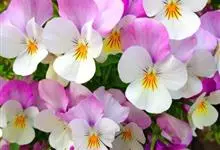 角堇:为堇菜科堇菜属多年生草本植物。株高10-30厘米 ,宽幅20-30厘米。具根状茎。茎较短而直立,分枝能力强。花两性,两侧对称,花梗腋生,花瓣5,花径 2.5-4.0厘米。花色丰富,…全部>>