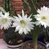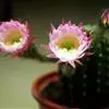 仙人球花 仙人掌科,仙人球属。植株单生或成丛。幼株球形,老株长成圆筒状,高可达75厘米,直径12-15厘米。球体暗绿色,具棱11-12。刺锥状,黑色,长1-1.5厘米。花着生于球体侧方,大型嗽喇叭状…全部>>