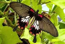 玉斑凤蝶Papilio helenus 别名白纹凤蝶,是凤蝶科凤蝶属美凤蝶亚属大型种类。雌雄同型;体翅皆黑色,后翅正面中室外有3个并列的白色斑,亚外缘有1列模糊的新月形红色斑,…全部>>