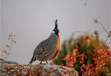 红腹角雉属于鸡形目雉科,雄鸟体羽及两翅主要为深栗红色,满布具黑缘的灰色眼状斑,下体灰斑大而色浅。雌鸟上体灰褐色,下体淡黄色,杂以黑、棕、白斑。全部>>