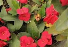 铁海棠为大戟科大戟属蔓生灌木植物;茎多分枝,具纵棱,呈旋转状;叶互生,通常集中于嫩枝上;每个花序基部边缘具微小的红色尖头;苞叶先端圆且具小尖头,无柄,上面鲜红色,下面淡红色;苞片丝状;子房光滑无毛,…全部>>