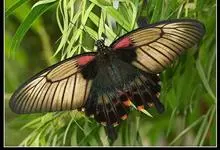 玉斑凤蝶Papilio helenus 别名白纹凤蝶,是凤蝶科凤蝶属美凤蝶亚属大型种类。雌雄同型;体翅皆黑色,后翅正面中室外有3个并列的白色斑,亚外缘有1列模糊的新月形红色斑,…全部>>