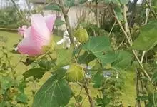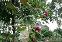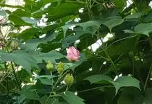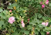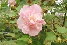 木芙蓉,锦葵科木槿属落叶灌木或小乔木。小枝上有细绒毛;叶片为卵状心形,托叶为披针形,常早落;花单生,花萼为钟形,花冠初为白色或淡红色,后逐渐变为深红色;果实为扁球形,有淡黄色的毛附着。花期8到10月。…全部>>