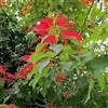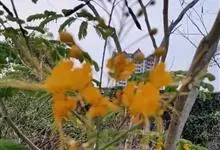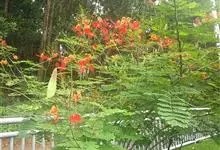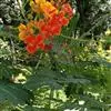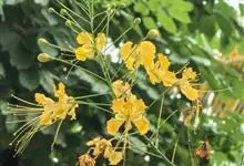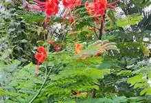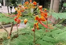洋金凤 Sw.),豆科小凤花属灌木状或小乔木植物,枝无毛,绿或粉绿色;二回羽状复叶;总状花序伞房状,萼片无毛,花瓣橙红或黄色,圆形,花丝红色,子房无毛,花柱橙黄色;荚果窄而薄,…全部>>