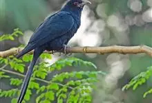 斑翅凤头鹃: 成鸟具羽冠,上体及头侧、翅、尾等黑色,具铁绿色亮辉,尾羽端部具白斑,两侧者形宽,中央者较狭;下体白色、淡灰白或略带棕黄色。虹膜褐至红褐色;嘴黑色;脚灰蓝黑色。…全部>>