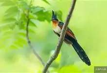 红翅凤头鹃:体长约38厘米,顶冠及凤头黑色,具显眼的直立凤头,背及尾黑色而带蓝色光泽,翅栗红色,喉及胸橙褐色,颈圈白色,腹部近白。虹膜淡红褐色。嘴黑色,下嘴基部近淡土黄色,嘴角肉红色,脚铅褐色。…全部>>