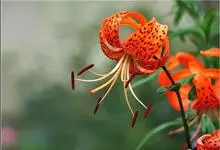 卷丹是百合科百合属植物。鳞茎近宽球形,鳞片宽卵形,呈白色;茎带紫色条纹,具白色绵毛;叶散生,矩圆状披针形或披针形,两面近无毛,先端有白毛,边缘有乳头状突起,上部叶腋有珠芽;花下垂,花被片披针形,…全部>>