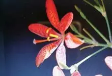 射干 Redouté)是鸢尾科射干属多年生草本植物。根状茎为不规则的块状,斜黄色或黄褐色;花橙红色,散生紫褐色的斑点;花药呈条形;子房下位,倒卵形;蒴果倒卵形或长椭圆形;种子圆球形,黑紫色,有光泽。…全部>>