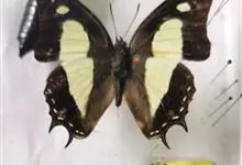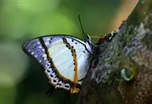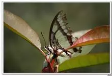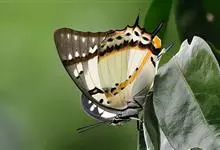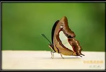 大二尾蛱蝶两翅正面黑色,中域有一浅绿色大型宽带纹,两翅反面浅绿色,中域有一缀黑边的褐色弧纹,亚外缘还有一深褐色横纹,后翅各有尾突两条,…全部>>