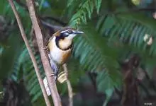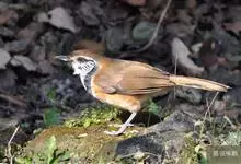黑领噪鹛是雀形目画眉科噪鹛属鸟类,又名领笑鸫。头顶和上体褐色;眼先和眉纹白色;脸部具黑白相间的纵纹;颈侧至胸前具显著的黑色宽带,形成一半领环,其后方的颈背向下至两胁皆为棕黄色,其余下体白色;尾褐色,…全部>>