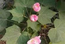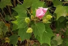木芙蓉,锦葵科木槿属落叶灌木或小乔木。小枝上有细绒毛;叶片为卵状心形,托叶为披针形,常早落;花单生,花萼为钟形,花冠初为白色或淡红色,后逐渐变为深红色;果实为扁球形,有淡黄色的毛附着。花期8到10月。…全部>>