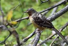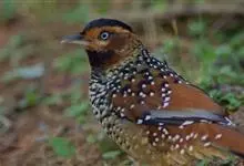 大噪鹛:中型鸟类,体长32-36厘米。额至头顶黑褐色,背栗褐色满杂以白色斑点,斑点前缘或四周还围有黑色。初级覆羽、大覆羽和初级飞羽具白色端斑。尾特长,均具黑色亚端斑和白色端斑。颏、喉棕褐色,…全部>>