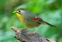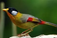 银耳相思鸟小型鸟类,体长14~18厘米。头顶黑色,耳羽银灰色,前额橙黄色;外侧飞羽橙黄色,基部朱红色,极为鲜艳、醒目。尾圆形,尾上、尾下覆羽朱红色,尾暗灰褐色,外侧尾羽橙黄色,其余上体橄榄绿或橄榄黄色。…全部>>