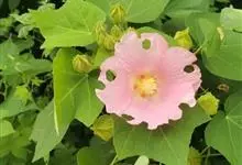 芙蓉葵是锦葵科,木槿属,拉丁学名,又名草芙蓉、大花秋葵,原产于北美。落叶灌木状。叶大、广卵形,叶柄、叶背密生灰色星状毛。花大,单生于叶腋,有白、粉、红、紫等色。喜阳、略耐阴,宜温暖湿润气候,忌干旱,…全部>>