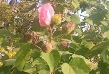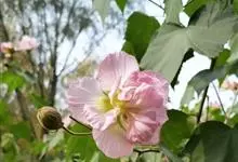 木芙蓉,锦葵科木槿属落叶灌木或小乔木。小枝上有细绒毛;叶片为卵状心形,托叶为披针形,常早落;花单生,花萼为钟形,花冠初为白色或淡红色,后逐渐变为深红色;果实为扁球形,有淡黄色的毛附着。花期8到10月。…全部>>
