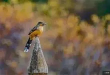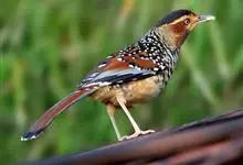大噪鹛:中型鸟类,体长32-36厘米。额至头顶黑褐色,背栗褐色满杂以白色斑点,斑点前缘或四周还围有黑色。初级覆羽、大覆羽和初级飞羽具白色端斑。尾特长,均具黑色亚端斑和白色端斑。颏、喉棕褐色,…全部>>