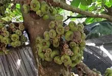 大果榕是桑科榕属的小乔木,株高可达10米;幼枝被柔毛;叶互生,宽卵状心形或近圆形;雄花无梗、匙形、花丝长,雌花生于雌株榕果内,子房白色;榕果簇生于树干基部或老茎短枝上、扁球形或陀螺形,…全部>>