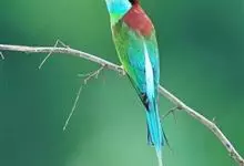 蓝喉蜂是蜂虎科蜂虎属鸟类。体长26-28厘米,嘴长而弯曲,有明显细长的中央尾羽。头部、颈部和背部为巧克力色,有黑色眼纹。喉部、腰部和尾羽为蓝色。腹部和两翼为绿色。幼鸟外观似成鸟,头部、颈部和背部为绿色,…全部>>