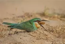 栗喉蜂虎是蜂虎科蜂虎属的鸟类。有热带鸟类羽毛艳丽的特征:喉部是栗红色的,黑色的过眼纹,翅膀和背部是绿色的,尾翼是蓝色的,飞行时翅膀下面的羽毛是橙黄色的,在阳光的照射下,它们全身闪烁着金属般的艳丽光泽,…全部>>