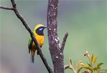 金额叶鹎是和平鸟科、叶鹎属的鸟类。体长16-20厘米。额和头顶前部金桔色,整个上体包括两翅表面草绿色。颏、喉黑色,其外围有一圈黄色,其余下体浅绿色,翼缘蓝紫色,翅上小覆羽翠蓝色。野外特征极明显,…全部>>
