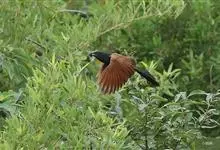 褐翅鸦鹃,是鹃形目鸦鹃科鸦鹃属的鸟类。褐翅鸦鹃的身体为黑色;头颈和胸带蓝紫色金属光泽并具黑亮的羽干纹,下胸至腹部泛金属绿光泽;两翼和肩部为棕栗色,外侧飞羽具暗色羽端,尾羽闪铜绿色光泽;虹膜赤红色,…全部>>