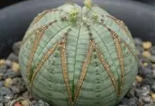 布纹球是大戟科、大戟属植物。植株小球形,直径8-12厘米。具棱8,整齐。表皮灰绿色中有红褐色纵横交错的条纹,顶部条纹较密。棱缘上有褐色小钝齿。雌雄异株,雌株球体较扁,雄株茎圆筒形,均为单生,…全部>>