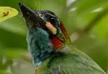 黑眉拟啄木鸟,为须䴕科、拟啄木鸟属的小型鸟类,体长20-25厘米,外形和金喉拟啄木鸟非常相似,但具粗著的黑色眉纹,头侧和耳覆羽以及下喉蓝色而不为银灰色,前颈两侧各有一块鲜红色斑。全部>>