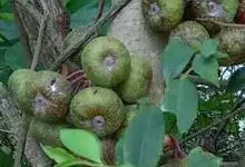 大果榕是桑科榕属的小乔木,株高可达10米;幼枝被柔毛;叶互生,宽卵状心形或近圆形;雄花无梗、匙形、花丝长,雌花生于雌株榕果内,子房白色;榕果簇生于树干基部或老茎短枝上、扁球形或陀螺形,…全部>>