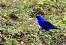 蓝大翅鸲是鹟科、大翅鸲属小型鸟类,体长19-21厘米。两翅尖长。雄鸟通体鲜紫蓝色具金属光泽。两翅和尾黑色。雌鸟上体灰褐色,头、颈、翕具棕白色纵纹,翅上有白色翅斑。虹膜暗褐色,嘴、脚黑色。…全部>>