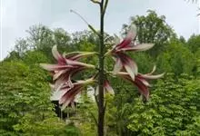 大百合 Makino)是百合科大百合属的多年生草本植物。小鳞茎卵形;叶纸质,网状脉,基生叶卵状心形或宽,茎生叶卵状心形;总状花序,花狭喇叭形,内具淡紫红色条纹,花丝向下渐扩大,子房圆柱形;蒴果近球形,…全部>>