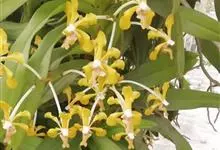 琴唇万代兰:兰科,万代兰属附生草本植物。茎长可达13厘米或更长,叶革质,带状,花序不分枝,通常疏生,花苞片卵形,花梗白色,纤细,花瓣近匙形,蕊柱白色,药帽黄色。4-5月开花。万代兰具有较强的抗旱能力,…全部>>